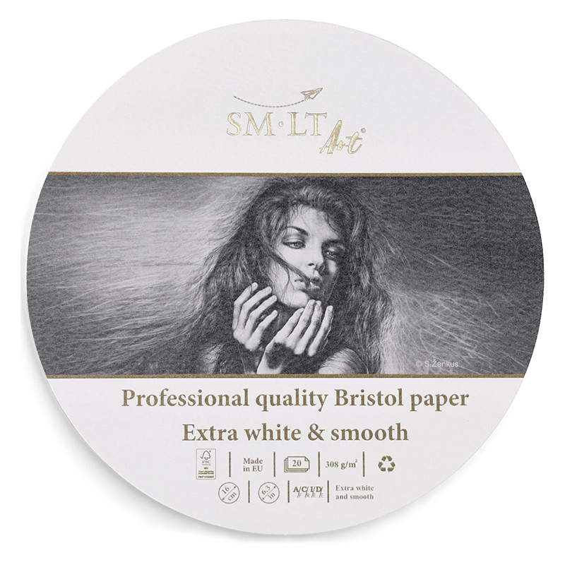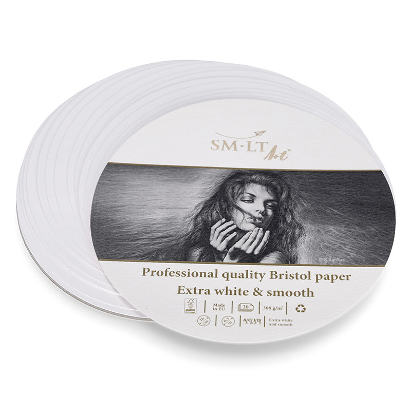 Professional Bristol marki SMLT – extra biały, uniwersalny papier o niezwykle gładkiej powierzchni. Oryginalny kształt pozwala tworzyć prace, które dobrze wpisują się w kształt koła. Arkusze papieru są luźne (nie są klejone) i maja średnicę 16 cm. Wysoka gramatura pozwala łączyć techniki malarskie z rysunkowymi. Posiada certyfikat FSC gwarantujący spełnienie restrykcyjnych norm gospodarki leśnej. Papier jest bezkwasowy i nie żółknie z czasem.