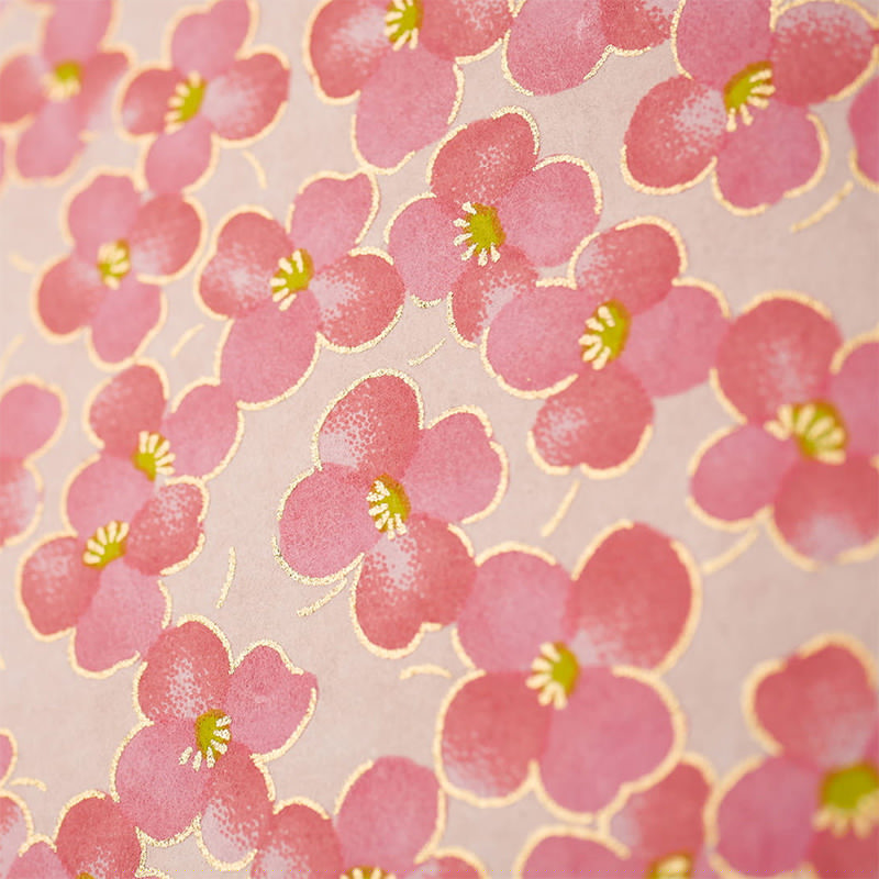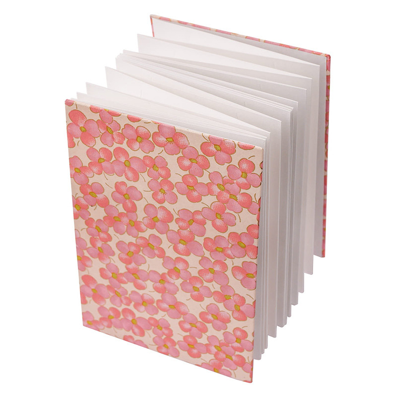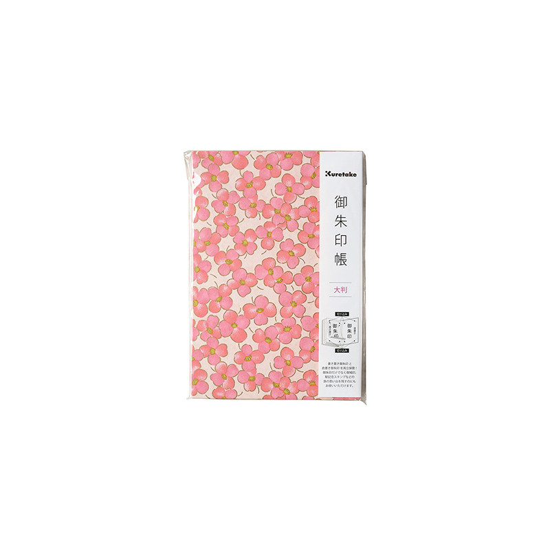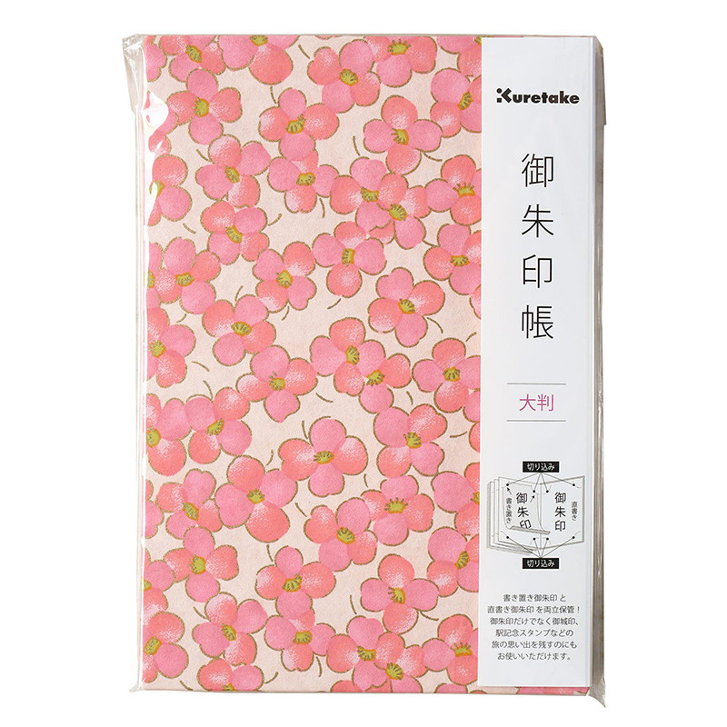 Album japoński Goshuincho marki Kuretake. Twarda okładka - różowe kwiaty ze złoceniami na różowym tle. Harmonijkowa forma z wyjątkowym papierem. Więcej szczegółów