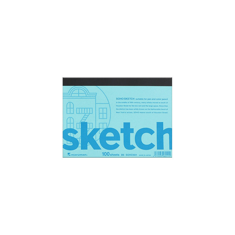Szkicownik SOHO Sketch marki Maruman. Uniwersalny papier do technik suchych i mokrych, 100 arkuszy, rozmiar 12.5 x 17 cm.