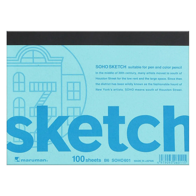 Blok szkicowy SOHO marki Maruman. Uniwersalny blok mix media o drobnoziarnistej fakturze. 100 arkuszy w formacie B6 (12.5 x 17 cm). Więcej szczegółów