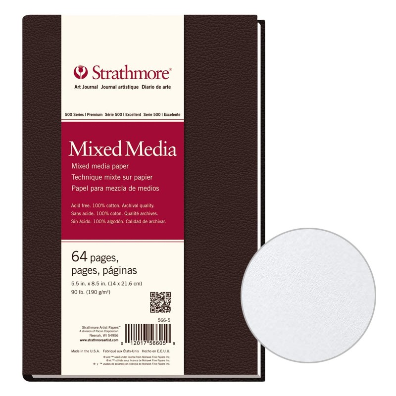 500 Series Mixed Media Hardbound Books – szkicownik marki Strathmore. Twarda oprawa, 32 kartki, gramatura 190 g, rozmiar 14 x 21,6 cm, trwały papier o welurowym wykończeniu.