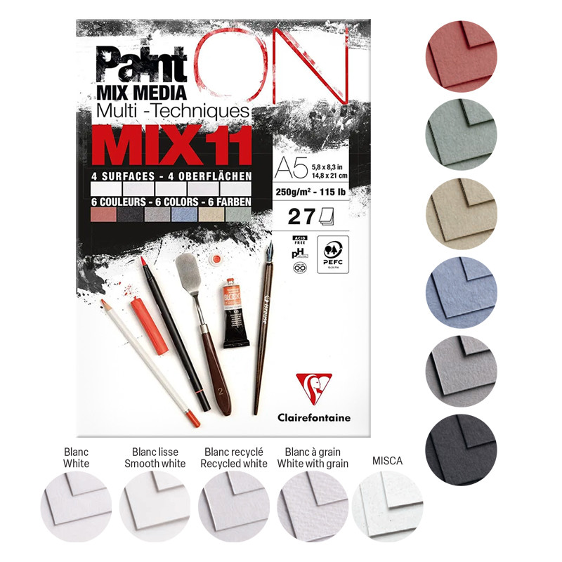 PaintON MIX11, uniwersalny blok marki Clairefontaine w formacie A5, 27 arkuszy o gramaturze 250 g/m². 11 różnych papierów serii Paint ON. Więcej szczegółów