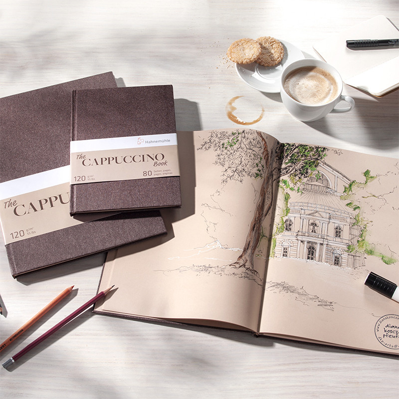 Blok szkicowy w twardej okładce Cappuccino marki Hahnemuhle. 40 arkuszy papieru w kolorze jasnego brązu, gramatura 120 g/m². Format A5. Więcej szczegółów