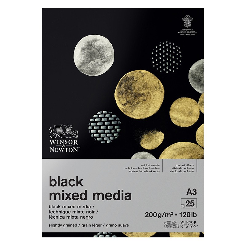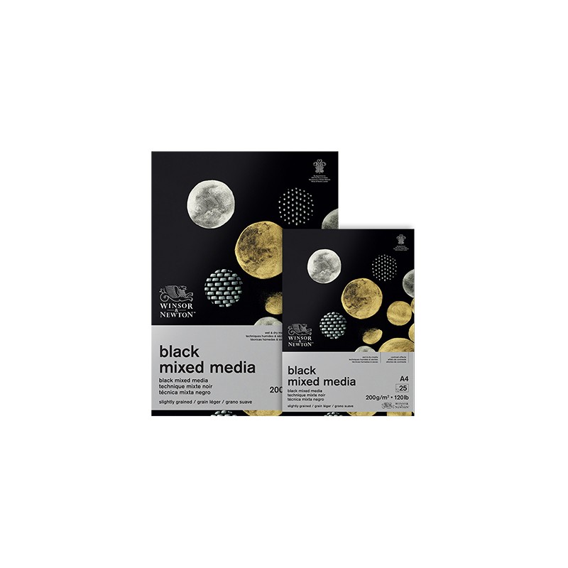 Blok Black Mixed Media marki Winsor & Newton. 25 drobnoziarnistych arkuszy w kolorze czarnym, w formacie A3 (29,7 x 42 cm). Gramatura 200 g/m².