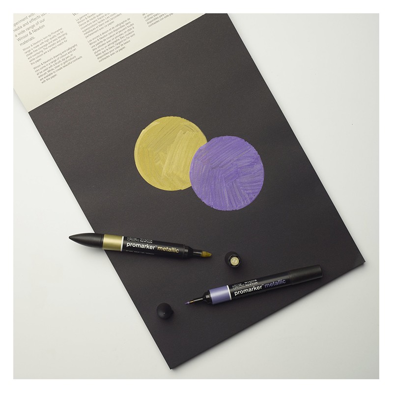 Blok z czarnym papierem barwionym w masie, przeznaczony do wszystkich technik. Dzięki wysokiej gramaturze papier może być stosowany zarówno z farbami wodnymi typu gwasz, akryl, akwarela jak i z technikami suchymi: kredkami, pastelami, węglami i kredą. Czarne arkusze to bardzo dobre podłoże do pisaków metalicznych W&N oraz dobrze napigmentowanych kredek. Tylna okładka wykonana jest z grubego, sztywnego kartonu, który z powodzeniem zastępuje podkładkę podczas pracy na przykład w plenerze. Papier jest bezkwasowy (nie żółknie z czasem), posiada certyfikat FSC oraz pozbawiony jest wybielaczy optycznych.