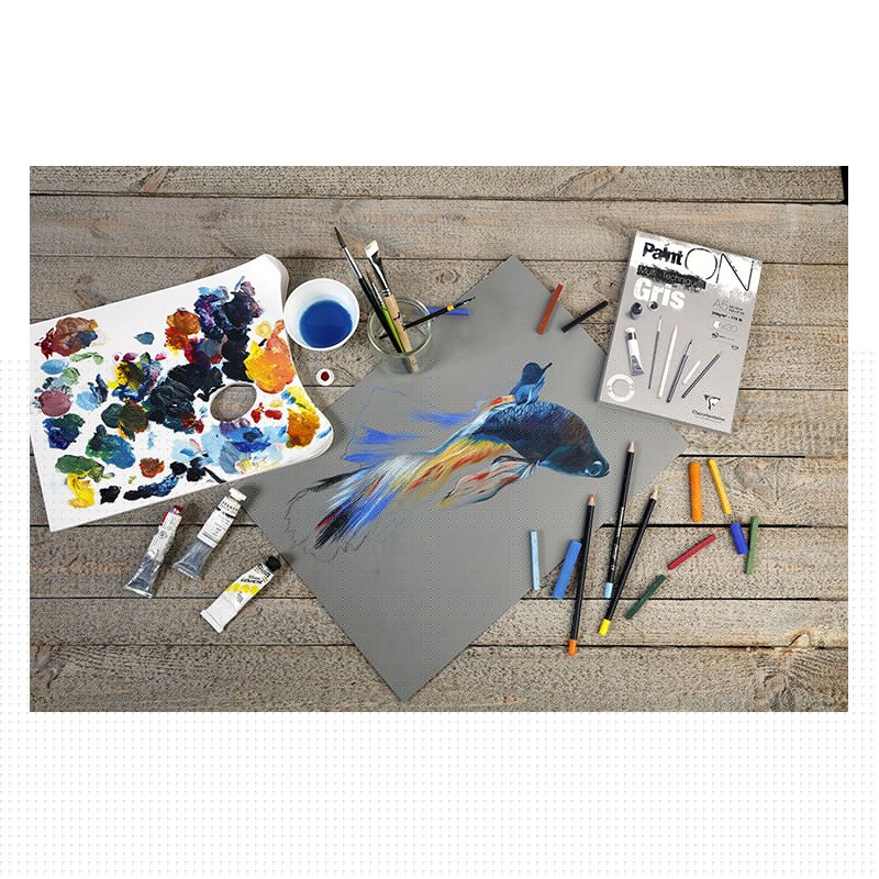 Paint ON Gris A5 – uniwersalny blok marki Clairefontaine. 30 drobnoziarnistych, szarych i bezkwasowych arkuszy o gramaturze 250 g w formacie A5. Więcej szczegółów
