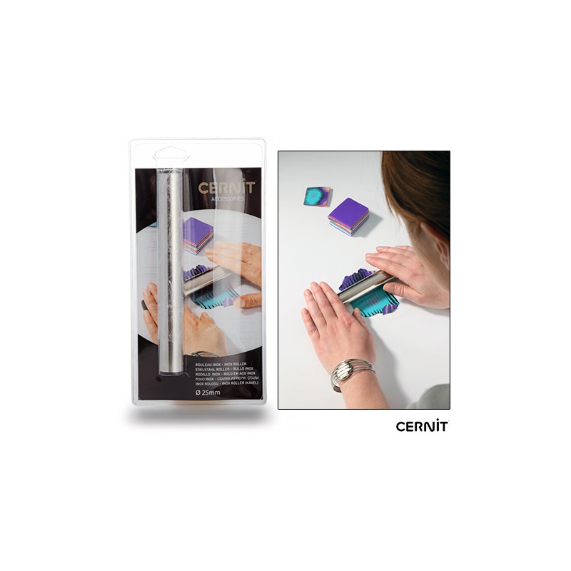Roller ze stali nierdzewnej służy do wałkowania mas plastycznych Cernit i wygładzania ich powierzchni. Nie przywierają one do narzędzia, a duże rozmiary (20 cm długości, 25mm średnicy) sprawiają, że praca przebiega komfortowo i szybko. Rozwałkowana masa posłużyć może np. do wycinania kształtów z użyciem foremek bądź do wykorzystania wraz z matami teksturowymi tej samej marki. Łatwy w czyszczeniu.