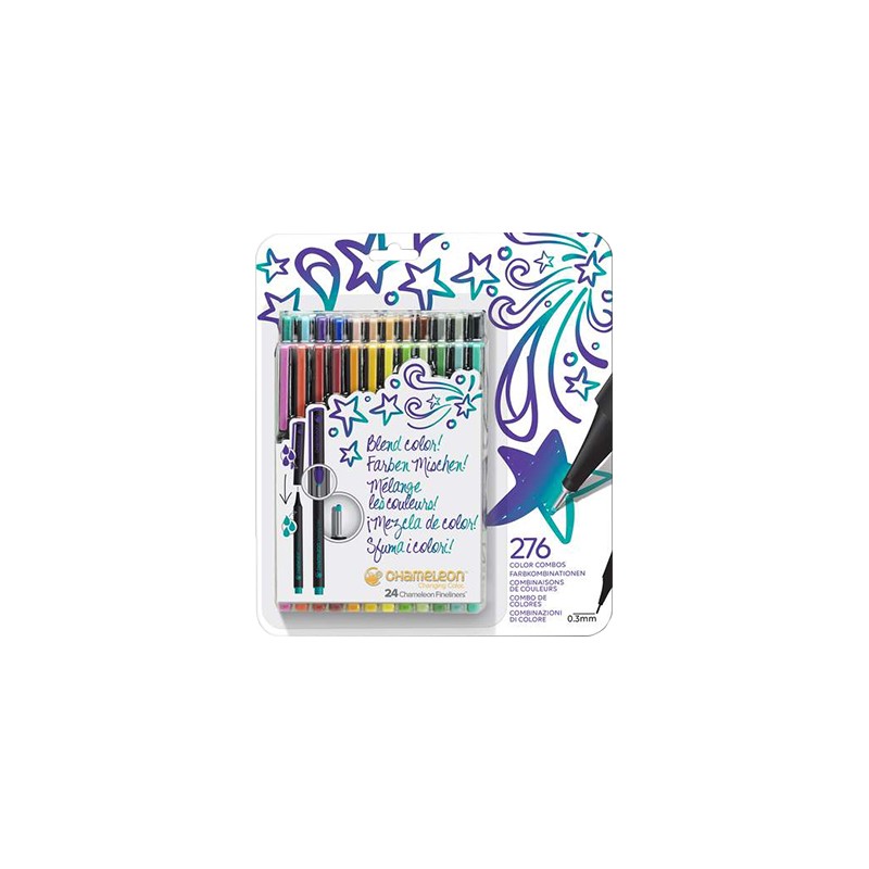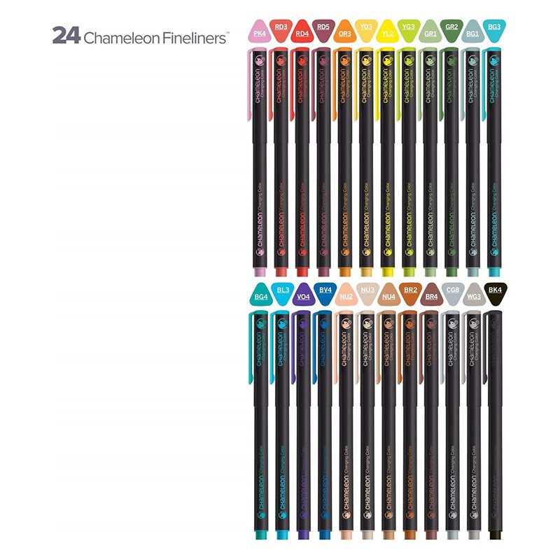 Fineliners Chameleon, Bright Colors: PK4 Peony Pink, RD3 Vermillion, RD4 Crimson Red, RD5 Burgundy, OR3 Tangerine, YO3 Warm Sunset, YL2 Summer Sun, YG3 Spring Meadow, GR1 Green Apple, GR2 Dark Sage, BG1 Lagoon, BG3 Turquoise, BG4 Aqua Marine, BL3 Sky Blue, VO4 Deep Violet, BV4 Blue Violet, NU2 Light Peach, NU3 Fawn, NU4 Caramel, BR2 Hot Cocoa, BR4 Burnt Umber, CG8 Cool grey, WG3 Warm Grey, BK4 Deep Black.