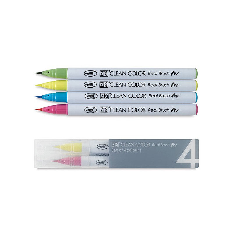 Zestaw 4 pisaków z końcówką prawdziwego pędzla z włosia syntetycznego. Tusz na bazie wody przypomina nasyconą farbę akwarelową. Gama czterech kolorów: Pink, Cobalt Blue, Light Green, Lemon Yellow.