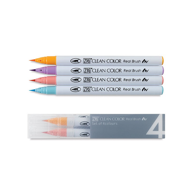 Zestaw 4 pisaków z końcówką prawdziwego pędzla z włosia syntetycznego. Tusz na bazie wody przypomina nasyconą farbę akwarelową. Gama czterech pastelowych kolorów: Light Carmine Red, Light Blue, Bright Yellow, Light Violet.