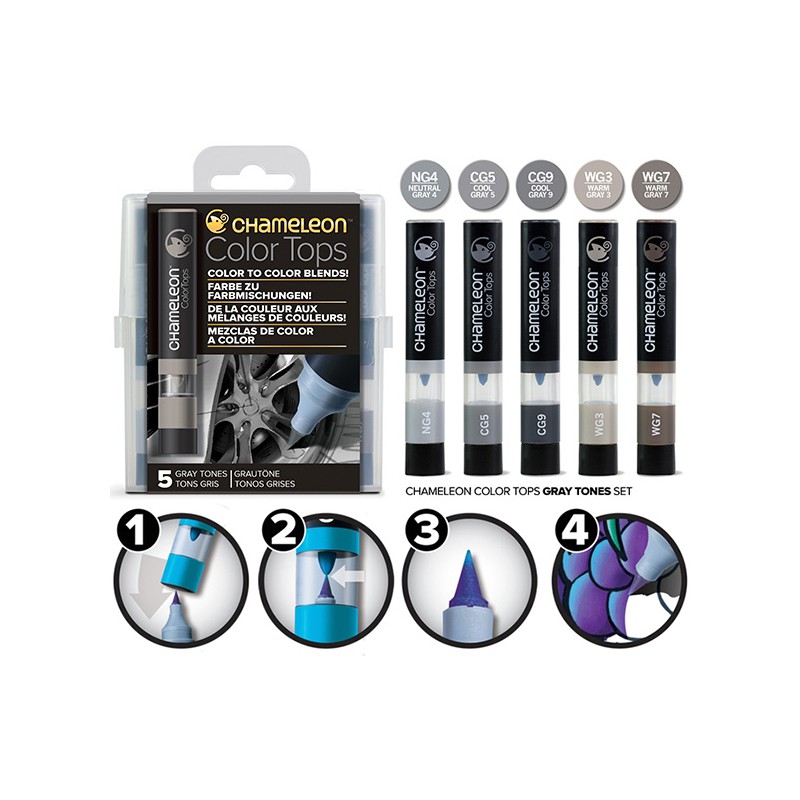 Zestaw Color Tops - 5 nakładek dedykowanych pisakom Chameleon Pens służące do tworzenia płynnych przejść kolorystycznych. Więcej szczegółów
