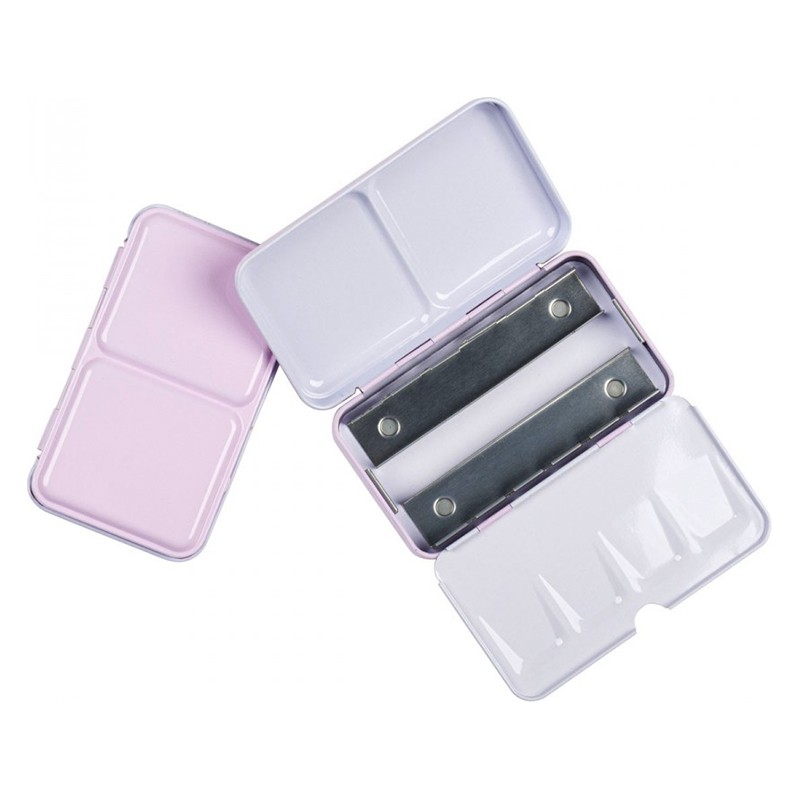 Metalowe, kieszonkowe etui w kolorze różowym przeznaczone na 12 półkostek farb akwarelowych + paleta.