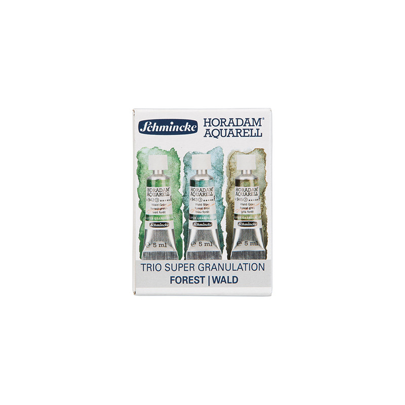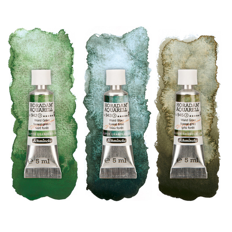 Komplet profesjonalnych super-granulujących farb akwarelowych Horadam Schmincke serii Forest. 3 tubki po 5 ml. Więcej szczegółów