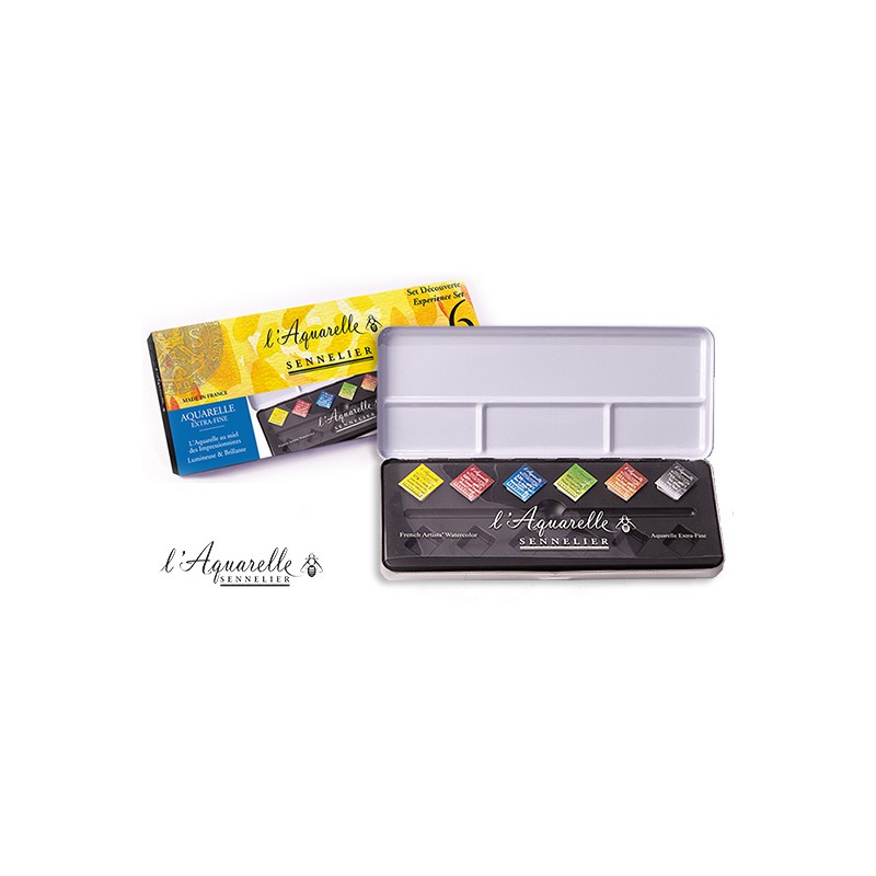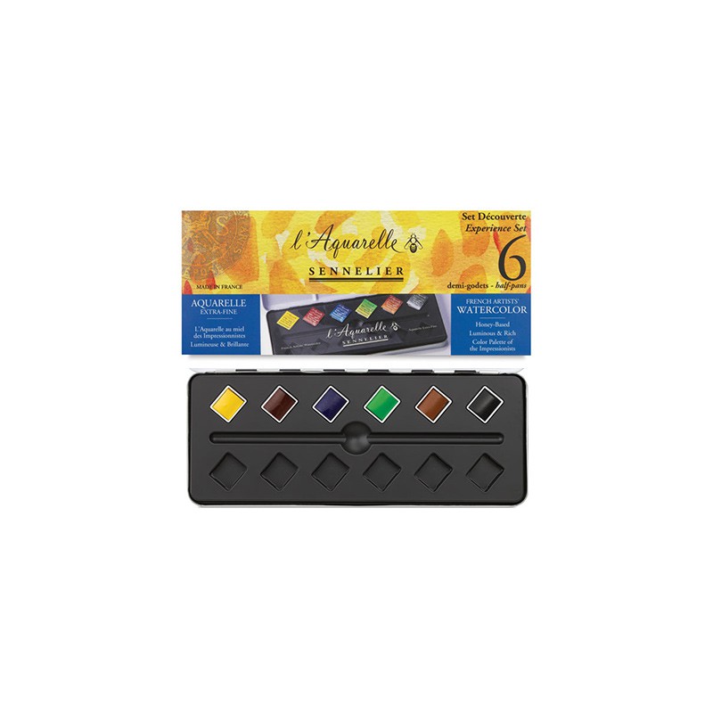 Prezentowany zestaw to metalowa skrzyneczka kryjąca 6 półkostek farby akwarelowej w kolorach: Burnt Sienna, Phthalo Blue, Sennelier Yellow Light, Alizarin Crimson, Ivory Black i Phthalo Green Light. Pokrywa może pełnić rolę palety, pomocnej przy nakładaniu i mieszaniu barw. Idealna propozycja dla osób chcących wypróbować farby z najwyższej półki, nie wydając dużych pieniędzy.
