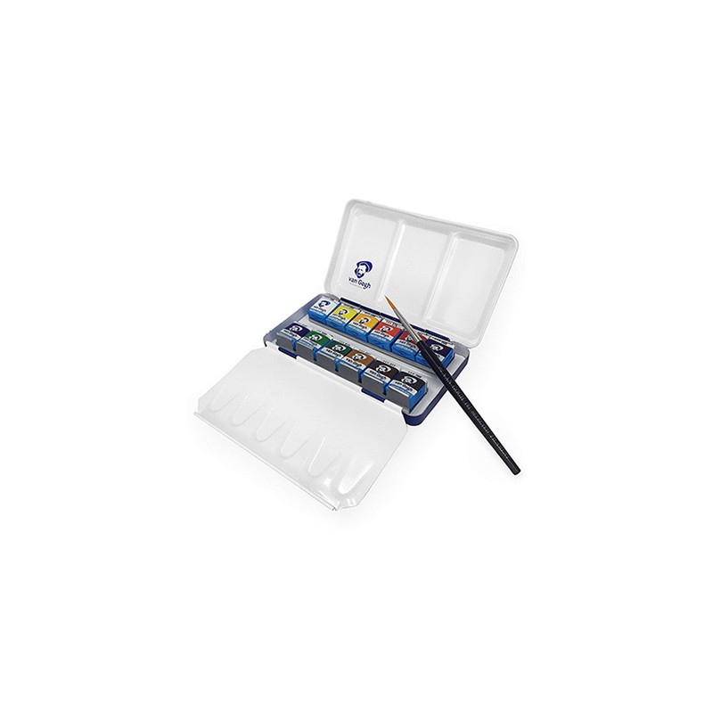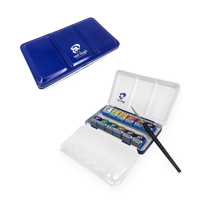 Wilgotne farby akwarelowe serii Van Gogh holenderskiej firmy Royal-Talens. Zestaw zawiera 12 kolorów farb w kostkach i modułowy pędzel z włosia syntetycznego akwareli (seria 191 nr 3). Całość umieszczona w eleganckiej, metalowej kasetce. Doskonale sprawdzi się w pracach plenerowych, gdyż jej wewnętrzna część może posłużyć także jako paleta do mieszania kolorów.