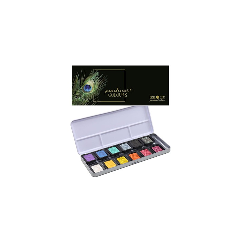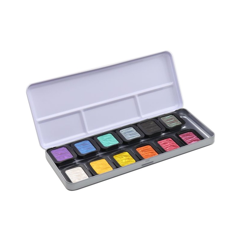 Pearlescent Colours niemieckiej marki Finetec - jedyne w swoim rodzaju, wysoko gatunkowe, kryjące akwarele. Wykonane z użyciem miki, naturalnego minerału dającego mieniący się efekt. Kolory mogą być mieszane ze sobą, doskonale nadają się do dekoracji kart okolicznościowych, prac akwarelowych, scrapbookingu oraz kaligrafii. Kolory wyglądają pięknie zarówno na jasnych jak i ciemnych powierzchniach. "Guziczki" o średnicy 3 cm zostały umieszczone w eleganckiej metalowej kasecie w której przewidziano miejsce również na pędzel. Dzięki przemyślanej konstrukcji opakowania istnieje możliwość wymiany czarnych plastikowych pojemniczków w których umieszczone są farby.