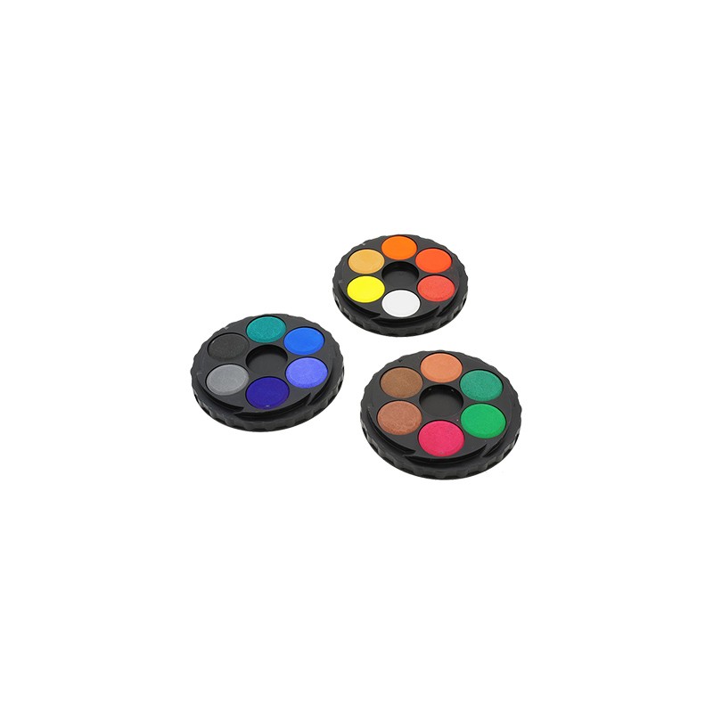 Pastylki farbek akwarelowych umieszczone są po sześć kolorów w specjalnych, okrągłych paletkach. Dzięki uniwersalnym zaczepom możemy połączyć, skręcając ze sobą, wszystkie lub wybrane części. Uzyskujemy wtedy kombinacje od 6 do 48 kolorów. Opakowanie tego typu jest praktyczne i kompaktowe, zestaw zajmuje wielokrotnie mniej miejsca niż inne, zawierające podobną ilość kolorów, ułożonych w tradycyjnej formie.