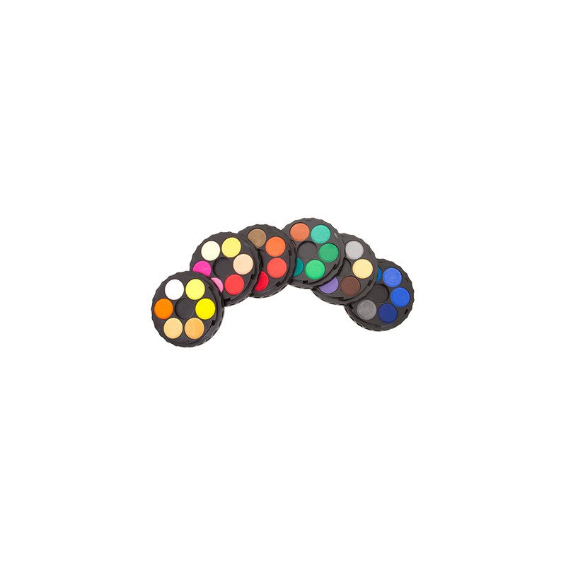 Pastylki farbek akwarelowych umieszczone są po sześć kolorów w specjalnych, okrągłych paletkach. Dzięki uniwersalnym zaczepom możemy połączyć, skręcając ze sobą, wszystkie lub wybrane części. Uzyskujemy wtedy kombinacje od 6 do 48 kolorów. Opakowanie tego typu jest praktyczne i kompaktowe, zestaw zajmuje wielokrotnie mniej miejsca niż inne, zawierające podobną ilość kolorów, ułożonych w tradycyjnej formie.