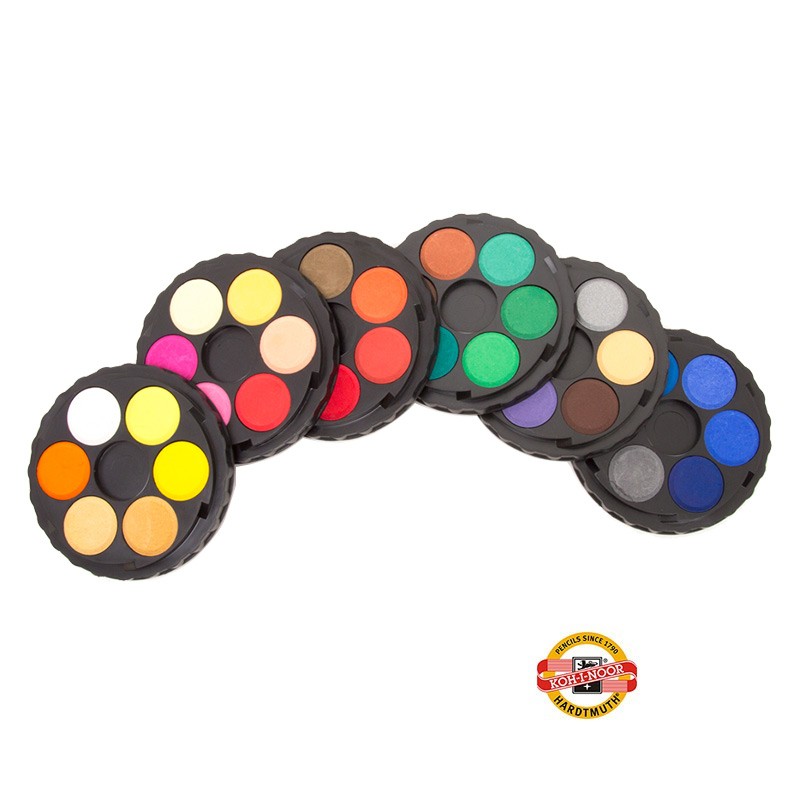 Farby akwarelowe Wheel marki Koh–I–Noor. 36 kolorów w krążkach o średnicy 2,25 cm. Intensywne, trwałe i kryjące. Umieszczone po 6 kolorów na okrągłej paletce. Więcej szczegółów