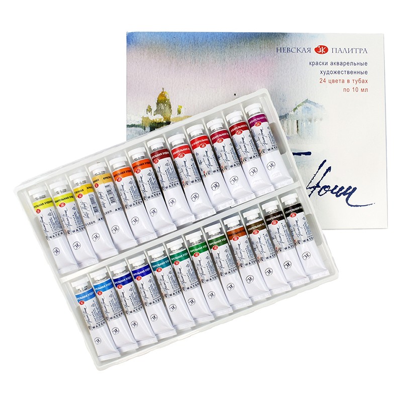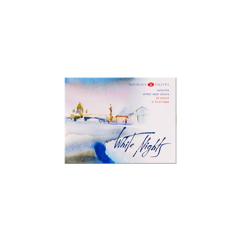 Profesjonalne farby akwarelowe White Nights rosyjskiej firmy Nevskaya Palitra. 24 kolory umieszczone w tubkach o pojemności 10 ml. Więcej szczegółów