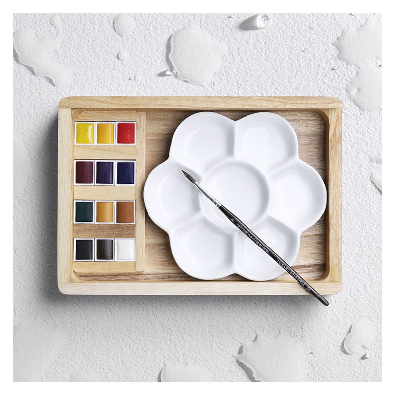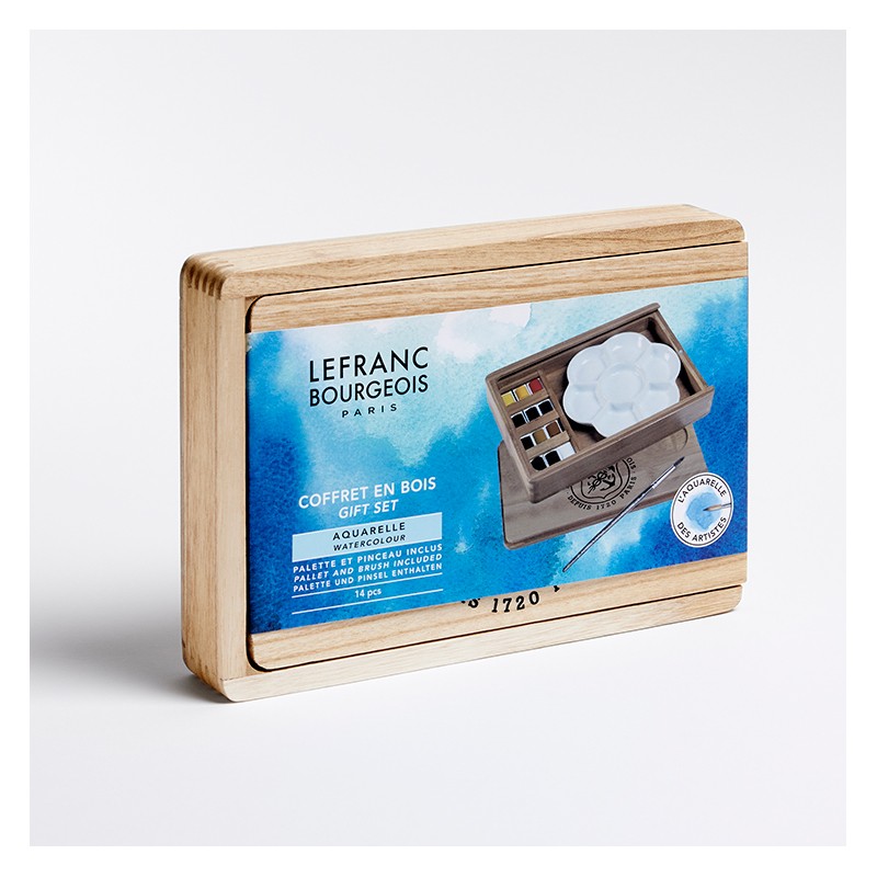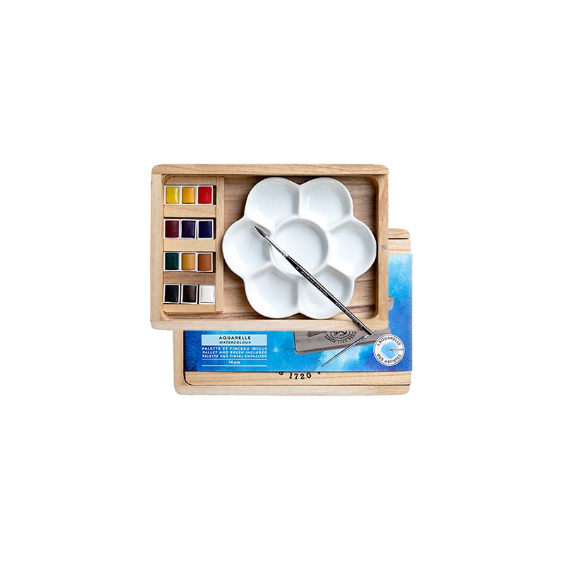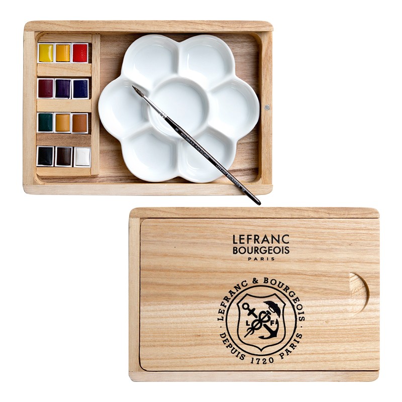Akwarele w półkostkach marki Lefranc & Bourgeois – zestaw 12 kolorów farby akwarelowej, 1 okrągły pędzel, ceramiczna paleta oraz drewniana kaseta. Więcej szczegółów