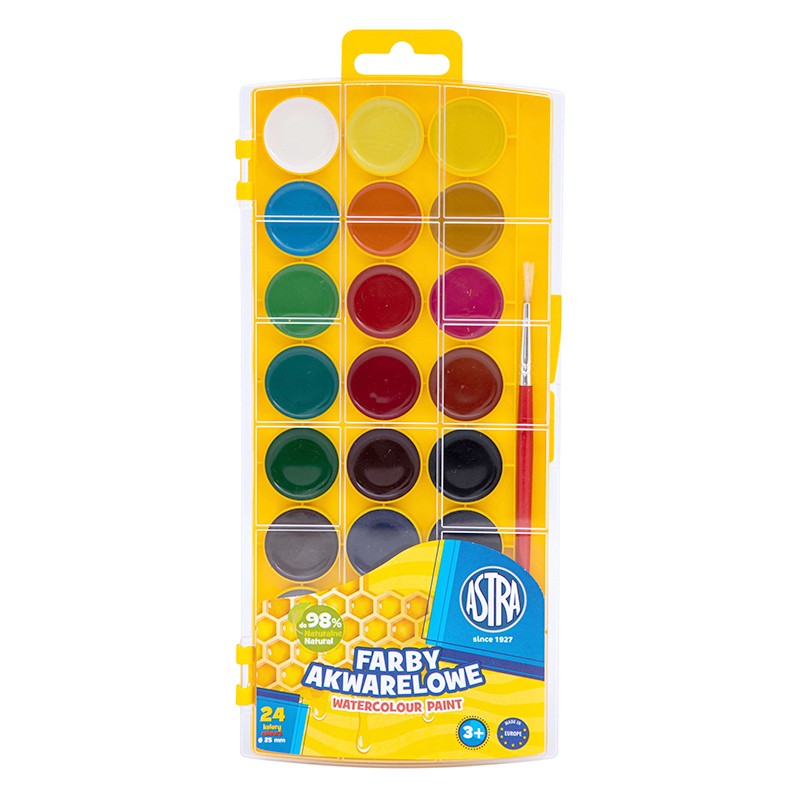 Zestaw 24 farb akwarelowych miodowych Astra o średnicy 25 mm.