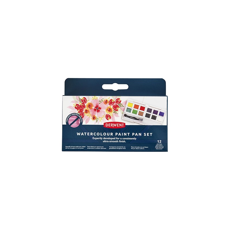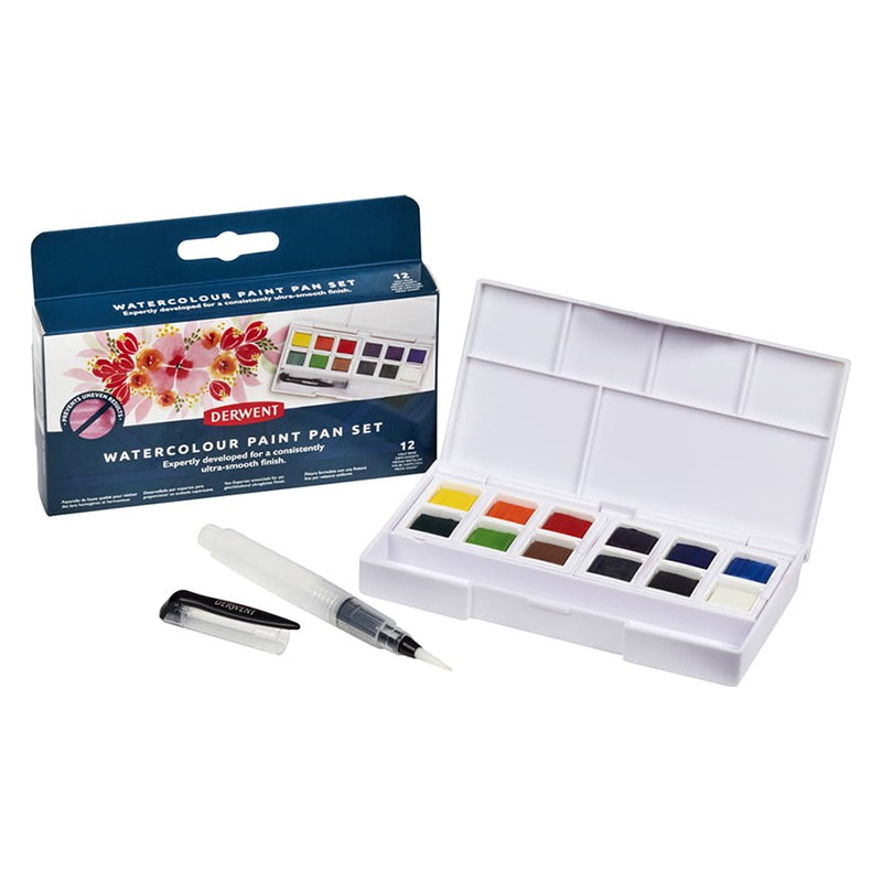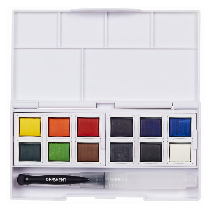 Farby akwarelowe marki Derwent zostały stworzone w oparciu o wysokiej jakości pigmenty odporne na działanie światła. Każdy z kolorów po nałożeniu oferuje gładkie wykończenie. Barwy doskonale mieszają się między sobą tworząc nowe odcienie. Komplet akwareli w półkostkach umieszczono w plastikowym etui wyposażonym w pusty pędzelek do napełniania. Wieczko kasetki służy jako paleta do mieszania kolorów. Produkt świetnie sprawdzi się podczas pracy w plenerze lub podróży.