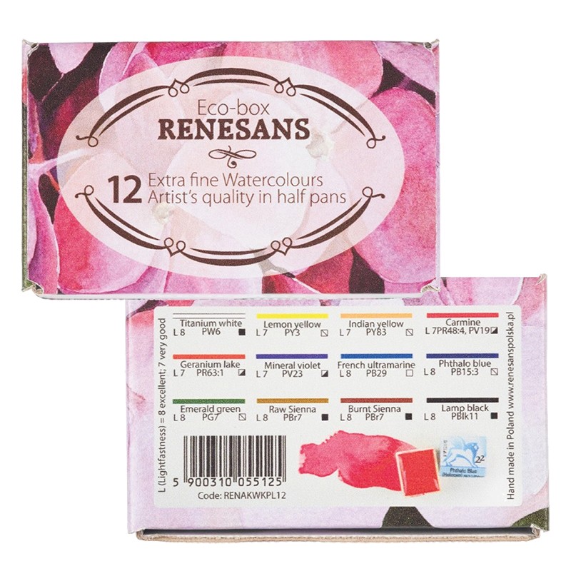 Eco-box farby akwarelowe w półkostkach marki Renesans. 12 farb w podstawowej gamie barw.