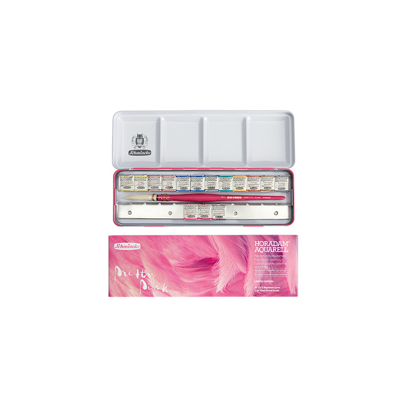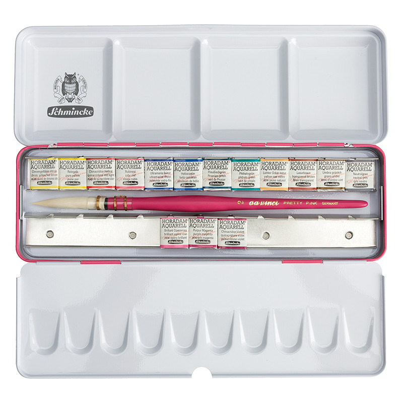 Zestaw akwareli Schmincke Horadam "Pretty Pink" – metalowe pudełko, 15 półkostek + pędzel Da Vinci