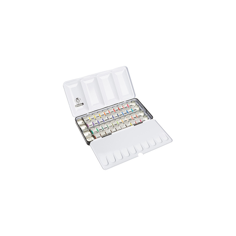 Zestaw akwareli Akademie marki Schmincke. 40 półkostek w pełnej dostępnej gamie barw. Metalowe etui + paleta do mieszania kolorów.