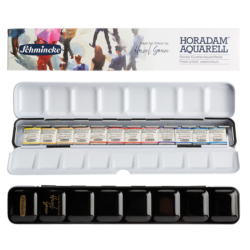 Artystyczne akwarele Horadam marki Schmincke. Najwyższej jakości artystyczne akwarele oparte na starannie dobranych komponentach, takich jak: wyselekcjonowana guma arabska oraz najczystsze pigmenty. Komplet 12 półkostek pozwala stworzyć szeroką paletę kolorów. Poręczne metalowe etui wyposażone w paletkę do mieszania farb świetnie sprawdzi się w plenerze i w trakcie podróży. Metalowa kasetka w kolorze czerni i bieli posiada uchwyt na palec i ma kieszonkowe wymiary, dzięki czemu jest wygodna w użytkowaniu. Profesjonalni artyści z całego świata polecają farby akwarelowe Horadam ze względu na ich niezrównaną jakość, świetlistość i szeroką gamę kolorów. Zestaw stworzony we współpracy z brytyjską akwarelistką Hazel Soan. Barwy w tym zestawie to najczęściej wybierane kolory przez akwarelistkę podczas jej pracy w plenerze.
