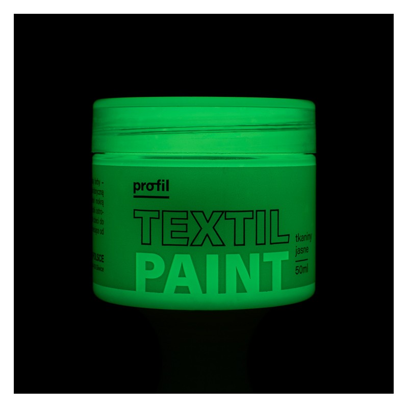 Farba Textil Paint (seria biała) – do tkanin jasnych marki Profil. Słoiczek o pojemności 50 ml. Do bawełny, lnu i jeansu. Farba świecąca w ciemności. Więcej szczegółów