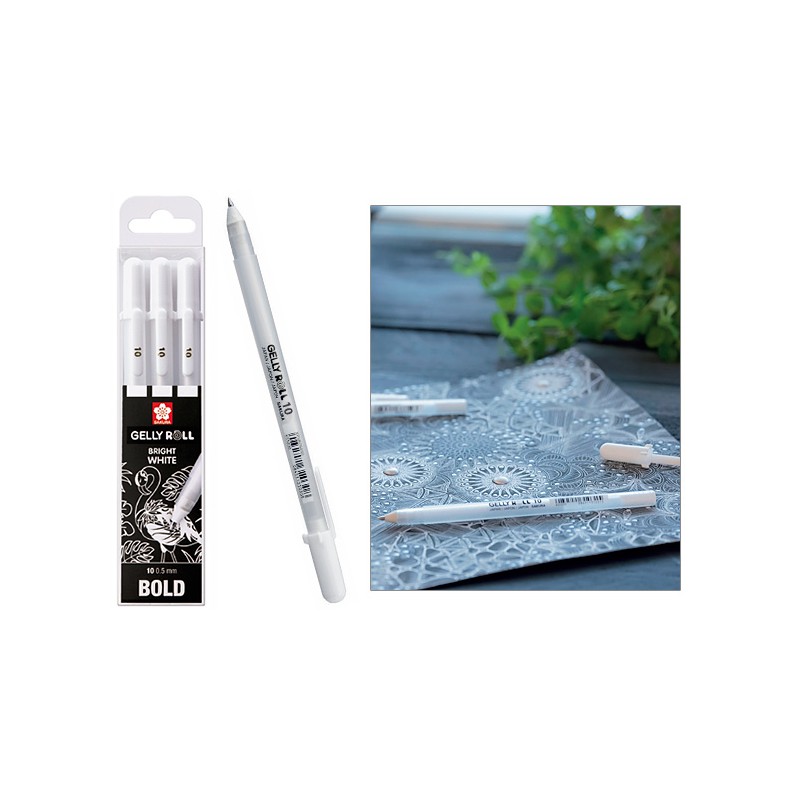 Gelly Roll Set Bright White 10 - 0,5 mm - zestaw 3 białych długopisów żelowych japońskiej marki Sakura. Pigmentowy tusz na bazie wody, po wyschnięciu nie rozmazuje się i jest wodoodporny. Specjalna technologia uwalniania tuszu gwarantuje gładkie prowadzenie i bardzo dobre krycie nawet na ciemnych papierach.