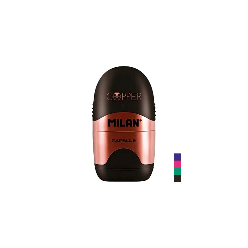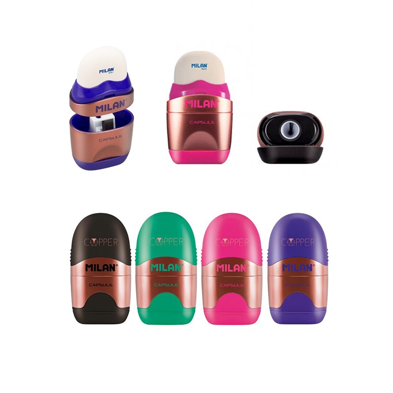 Połączenie temperówki z gumką do mazania to bardzo funkcjonalne rozwiązanie. Marka Milan dodatkowo ujęła całość w stylowy design i tak oto postała Capsule serii Copper. Temperówka ze stalowym ostrzem zapewnia bezpieczne i precyzyjne temperowanie a wysokiej jakości gumka do mazania z powodzeniem usunie ślady grafitu z różnego rodzaju podłoża. Obły kształt etui jest ergonomiczny i wygodnie leży w dłoni. dostępne kolory gumko-temperówki: copper-black / copper-pink / copper-green / copper-lilac.