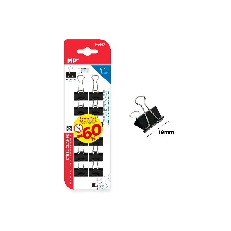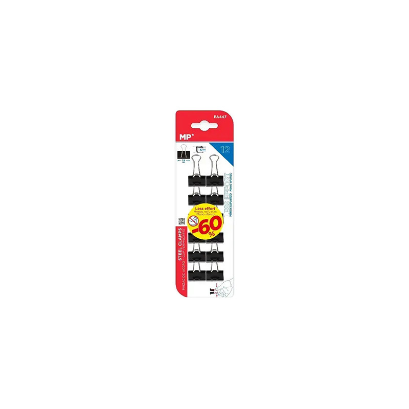 Zestaw klipsów do papieru marki MP. 12 klipsów w rozmiarze 19 mm.