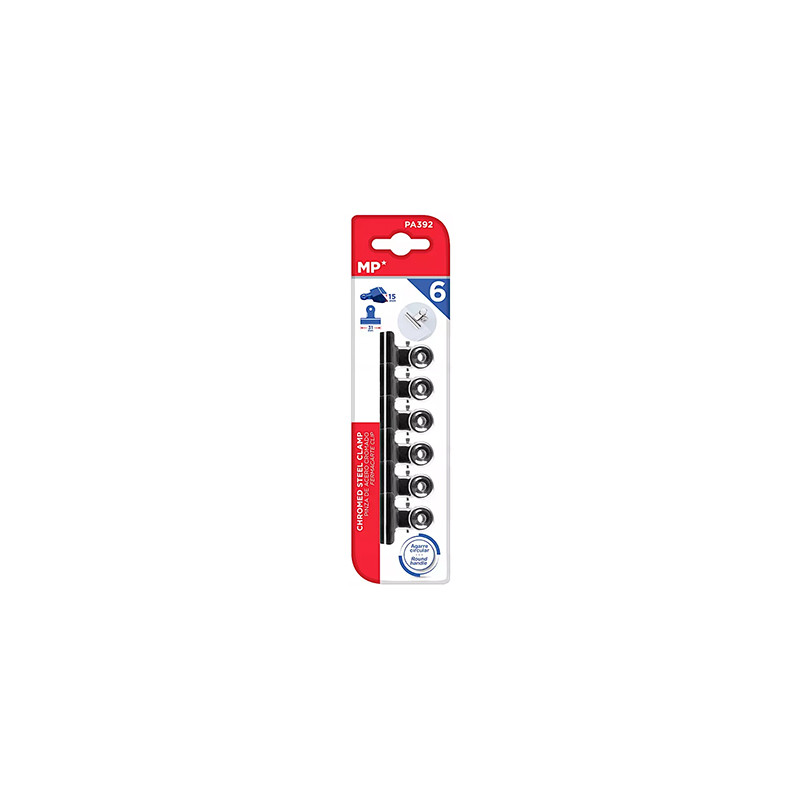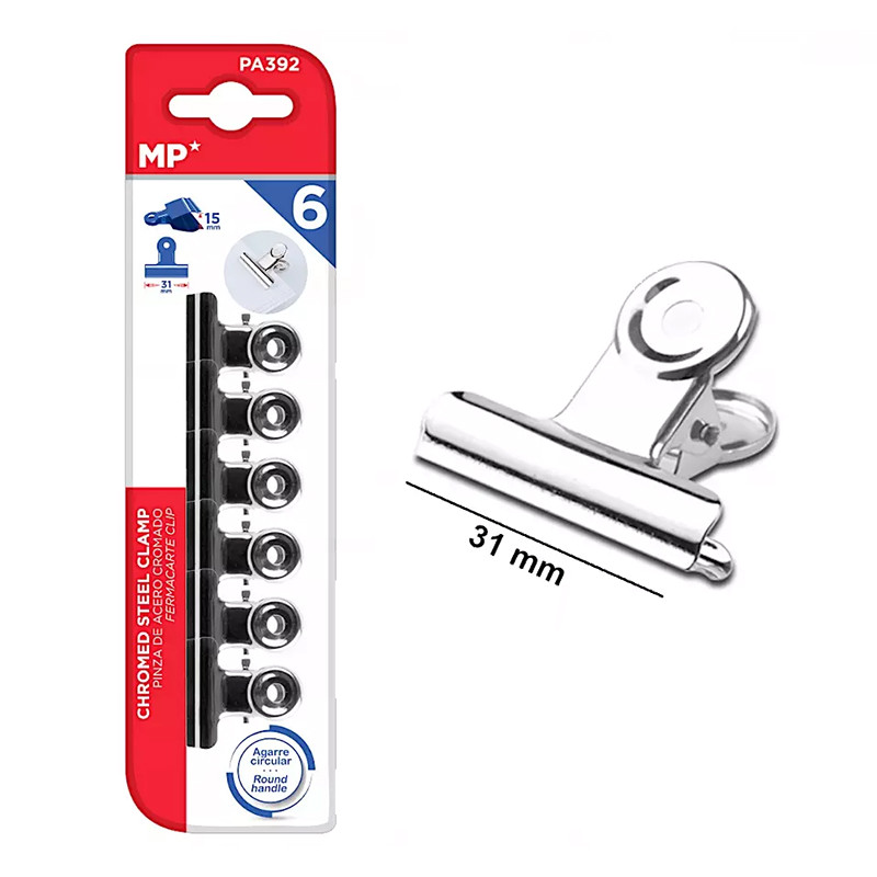 Zestaw klipsów do papieru marki MP. 6 klipsów w rozmiarze 31 mm.