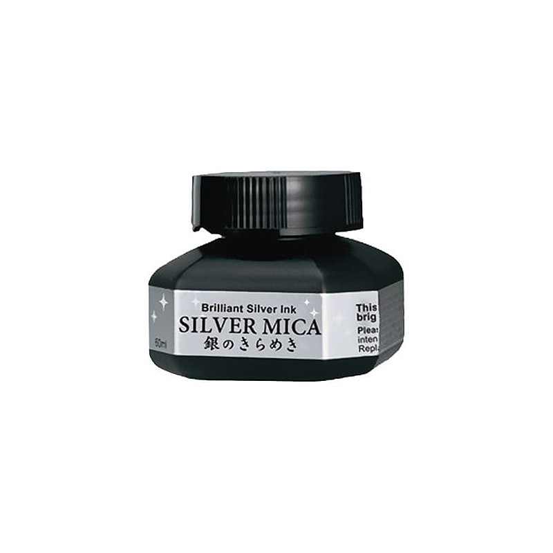 Silver Mica marki Kuretake. Srebrny, błyszczący tusz pigmentowy na bazie wody. Produkt przeznaczony do kaligrafii, scrapbookingu oraz wszelkich artystycznych prac na papierze. Perfekcyjnie sprawdza się na papierach w ciemnym kolorze. Najlepiej nanosić go za pomocą pędzla. Przed użyciem należy dokładnie wstrząsnąć - plastikowy kałamarz o pojemności 60 ml posiada w środku kuleczki do prawidłowego wymieszania tuszu z pigmentem.