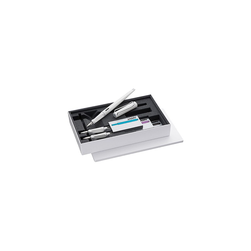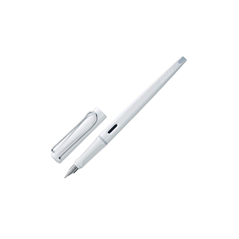 Pióro wieczne niemieckiej marki Lamy. Stylowy i ergonomiczny design gwarantuje wygodne ułożenie pióra w dłoni. Biała, aluminiowa skuwka z elastycznym, srebrnym zaciskiem z mosiężnego drutu, 3 stalówki z dociskiem klinowym w rozmiarze 1.1 mm, 1.5 mm oraz 1.9 mm. Błyszczące, białe wykończenie. Obudowa posiada otwór dzięki któremu możemy kontrolować ilość tuszu w naboju lub tłoczku. Stalówki z łatwością można wymienić na inny rozmiar. Pióro przeznaczone do użytku codziennego a także w celach profesjonalnych i hobbystycznych - stworzone z myślą o kaligrafii i handletteringu. Dodatkowo w skład zestawu wchodzi eleganckie, metalowe, białe pudełko z materiałową wytłoczką na poszczególne elementy, 3 opakowania naboi - czarne, turkusowe i fioletowe (łącznie 15 szt.).