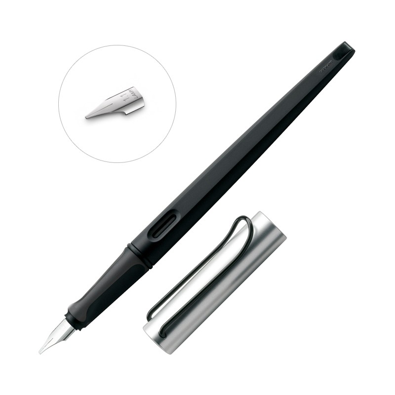 Pióro wieczne niemieckiej marki Lamy. Elegancki i ergonomiczny design gwarantuje wygodne ułożenie pióra w dłoni. Matowe czarne wykończenie obudowy, srebrna, aluminiowa skuwka z elastycznym, czarnym zaciskiem z mosiężnego drutu, stalówka w rozmiarze 1.1 mm wykonana ze stali nierdzewnej z dociskiem klinowym. Obudowa posiada otwór dzięki któremu możemy kontrolować ilość tuszu w naboju lub tłoczku. Stalówkę, w razie potrzeby, można z łatwością wymienić na inny rozmiar. Pióro przeznaczone do użytku codziennego a także w celach profesjonalnych i hobbystycznych - stworzone z myślą o kaligrafii i handletteringu.