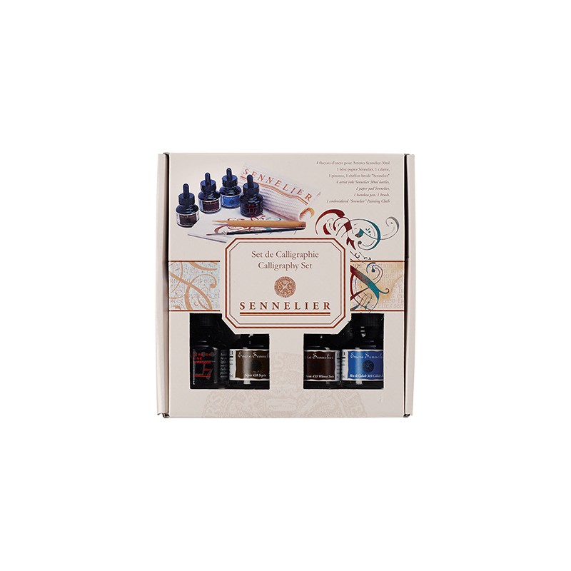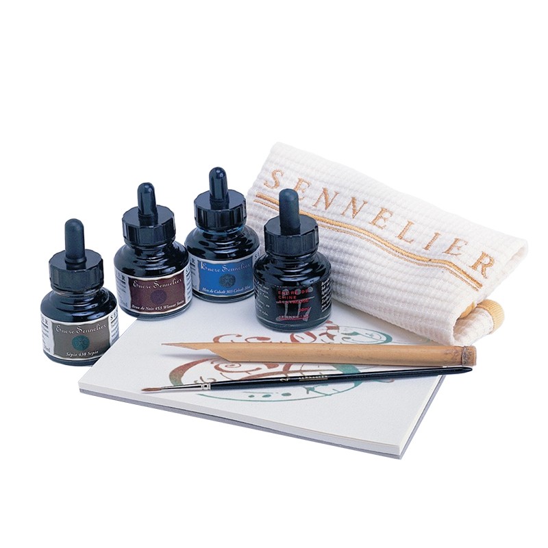 Calligraphy set marki Sennelier – 8-elementowy zestaw do kaligrafii. 4 tusze, piórko bambusowe, pędzel, blok do kaligrafii 17 x 17 cm oraz ściereczka z haftem. Więcej szczegółów