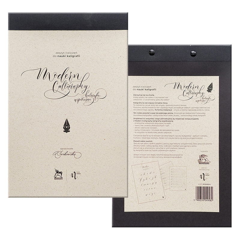 Modern Calligraphy – zeszyt ćwiczeń do nauki kaligrafii, A4. Opracowanie Aleksandra Ćwikowska. Wydawca: Renesans. Więcej szczegółów