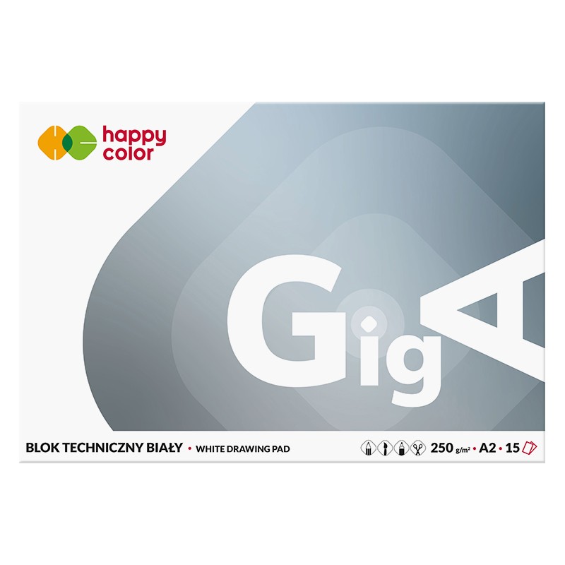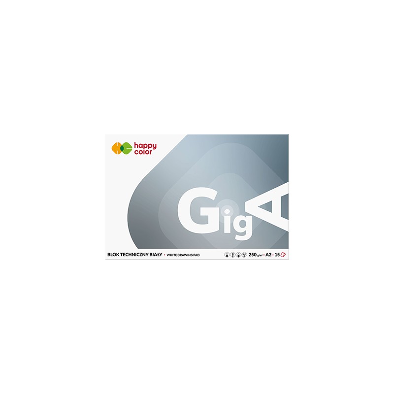 Blok techniczny serii Giga marki Happy Color. 15 białych arkuszy papieru w formacie A2 (42 x 59.4 cm), gramatura 250 g/m2. Więcej szczegółów