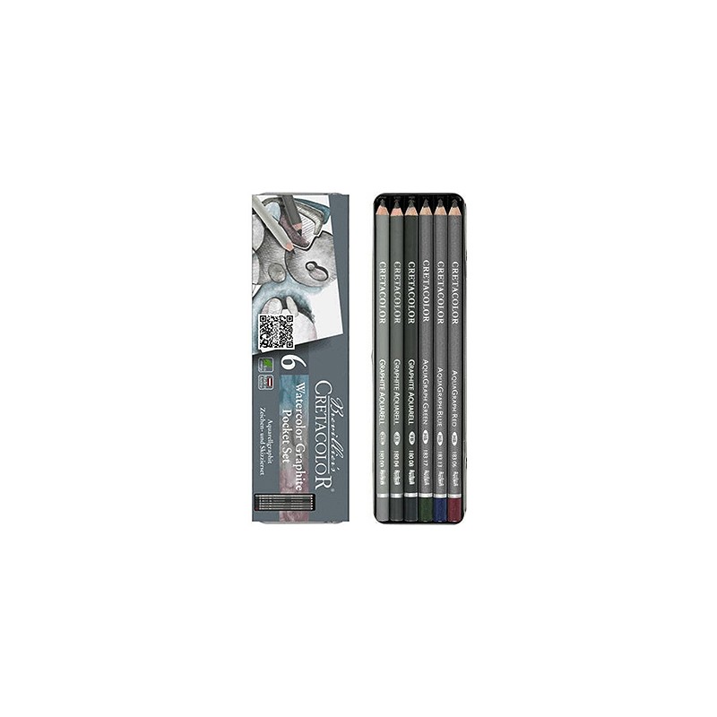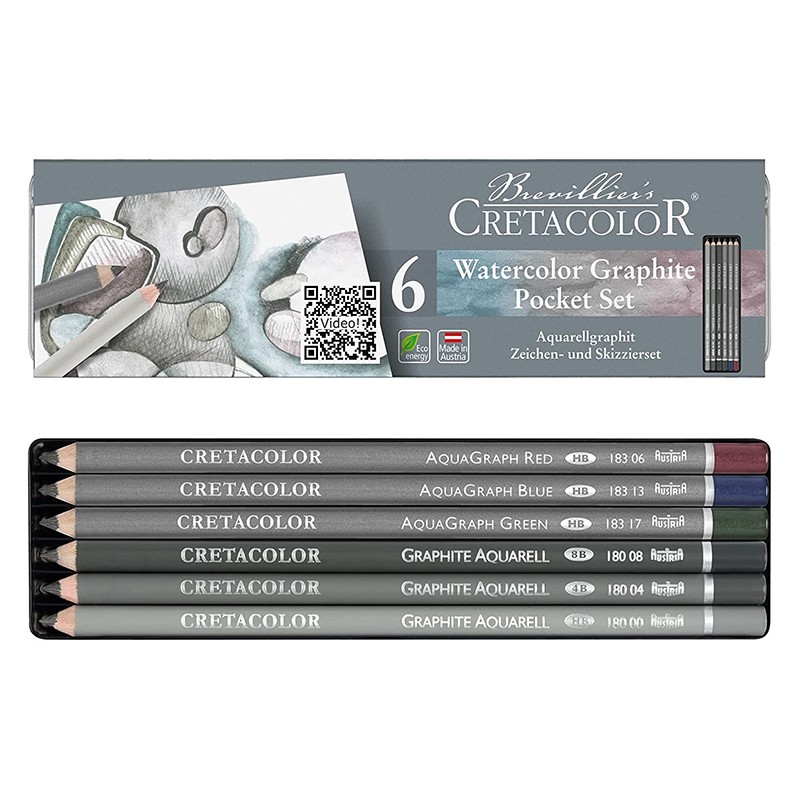 Zestaw rysunkowy Watercolor Graphite Pocket Set marki Cretacolor. 3 wodorozmywalne ołówki grafitowe i 3 kolorowe grafity w metalowym piórniku. Więcej szczegółów