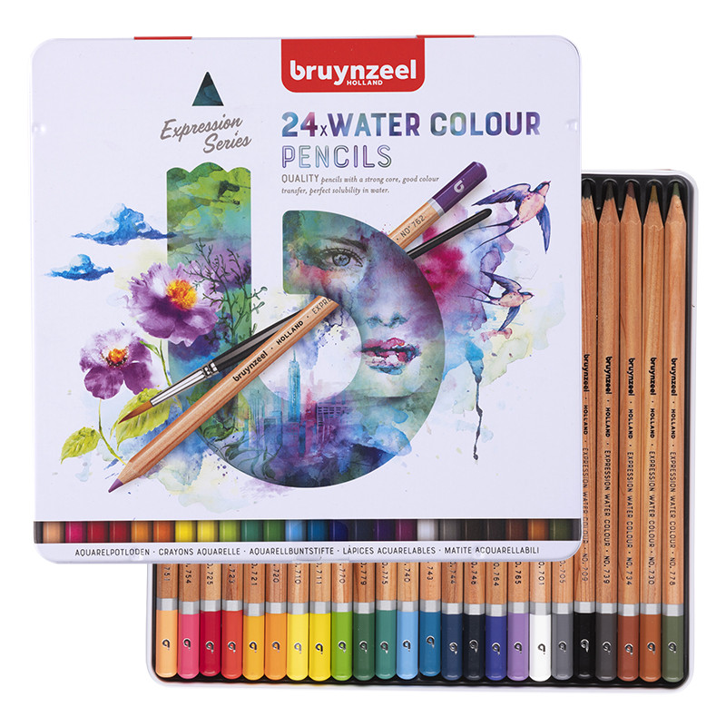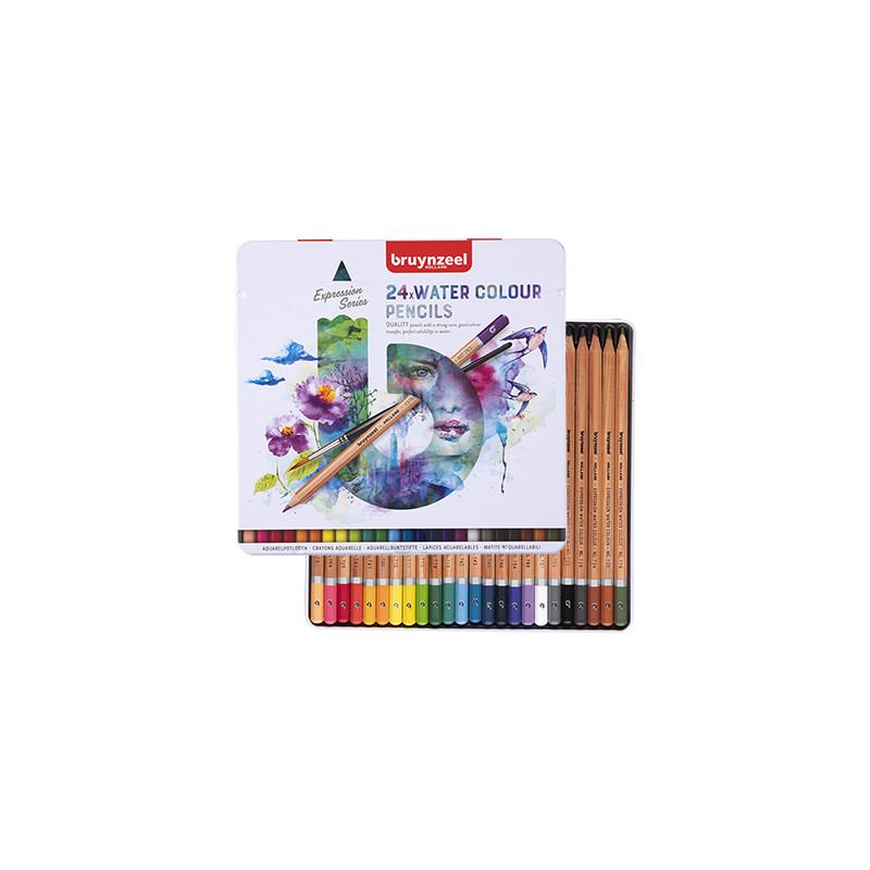 Zestaw wodorozpuszczalnych kredek akwarelowych Expression marki Bruynzeel. Wysokiej jakości kredki akwarelowe z mocnym, grubym rdzeniem o średnicy 2,9 mm, wyprodukowanych z wysokiej jakości pigmentów dla dobrego przenoszenia kolorów i całkowitej rozpuszczalności w wodzie. Kredki można stasować na mokro i na sucho. Do zestawu dołączono pędzel. Całość w metalowym piórniku, który zapewnia wygodny dostęp oraz bezpieczne przechowywanie. Do rysowania kredkami akwarelowymi polecamy bloki akwarelowe oraz akcesoria.