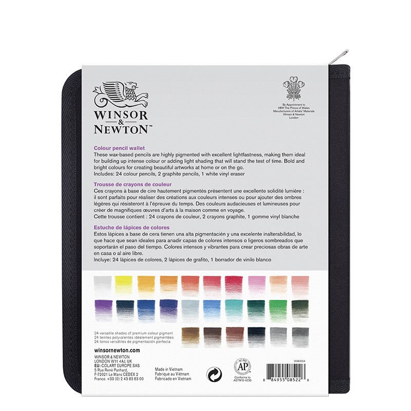 Artystyczne kredki rysunkowe marki Winsor & Newton. Zestaw 24 kolorów, gumka winylowa, 2 ołówki grafitowe. Całość w płóciennym piórniku zamykanym na zamek. Więcej szczegółów