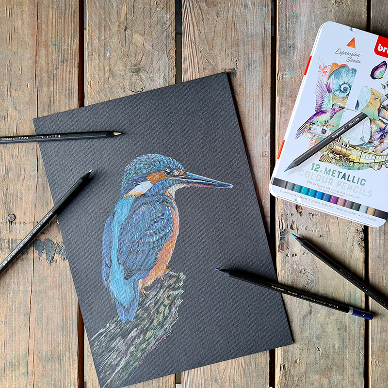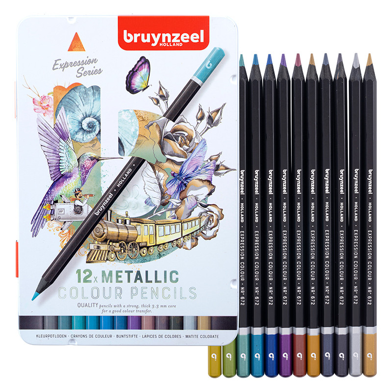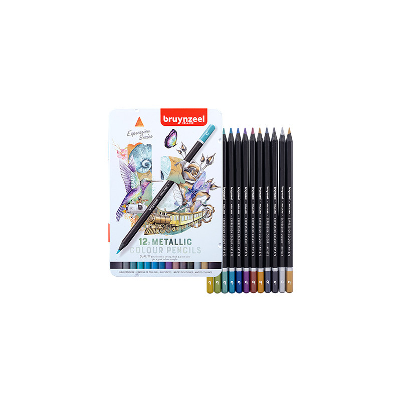 12 Metallic Colour Pencils – kredki rysunkowe Expression marki Bruynzeel w metalowym piórniku, 12 kolorów metalicznych.