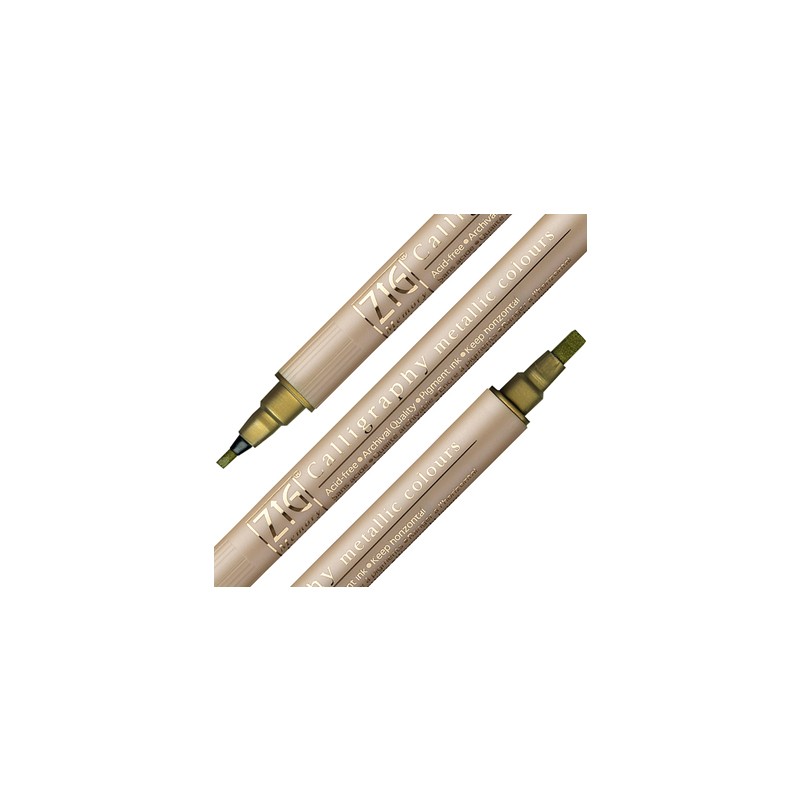 GOLD - Calligraphy metallic colours japońskiej marki Kuretake to dwustronny pisak w kolorze złotym. Wyposażony w dwie płasko ścięte końcówki - wąską Więcej szczegółów