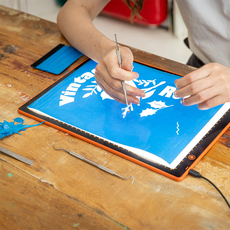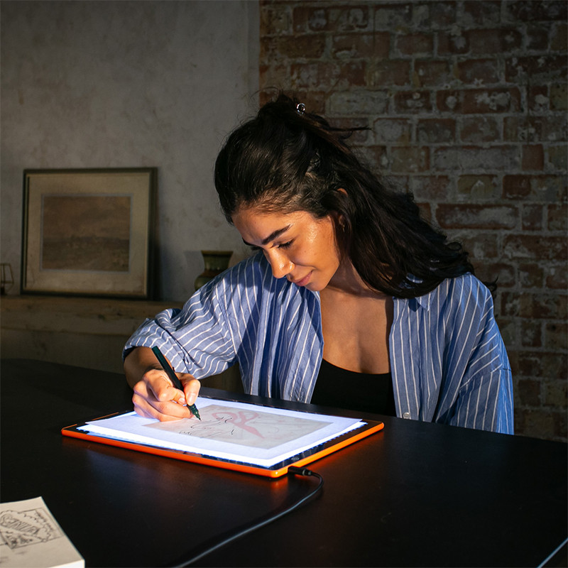 Równomierne oświetlenie LED o naturalnej temperaturze barwowej 6000K (światło dzienne) zapewnia wierne odwzorowanie kolorów i brak efektu migotania, co znacząco zmniejsza zmęczenie wzroku. Podświetlarka doskonale sprawdza się przy precyzyjnym przenoszeniu rysunków, szkiców i wzorów. Regulacja jasności umożliwia łatwe dopasowanie intensywności światła do rodzaju papieru oraz warunków otoczenia.