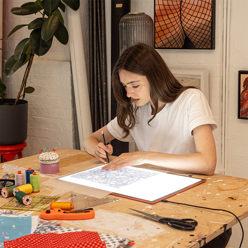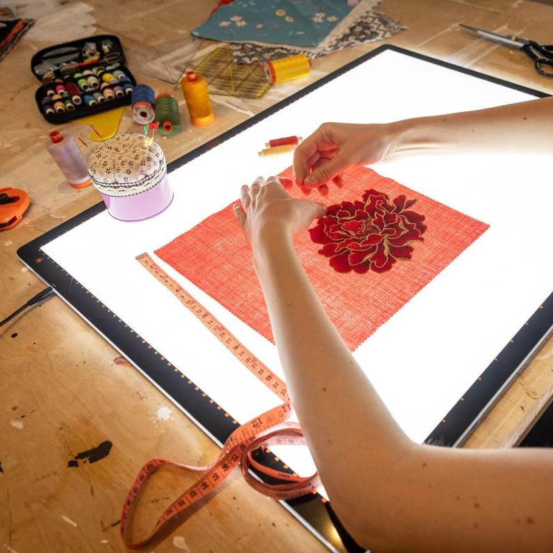 Równomierne oświetlenie LED o naturalnej temperaturze barwowej 6000K (światło dzienne) zapewnia wierne odwzorowanie kolorów i brak efektu migotania, co znacząco zmniejsza zmęczenie wzroku. Podświetlarka doskonale sprawdza się przy precyzyjnym przenoszeniu rysunków, szkiców i wzorów. Regulacja jasności umożliwia łatwe dopasowanie intensywności światła do rodzaju papieru oraz warunków otoczenia.