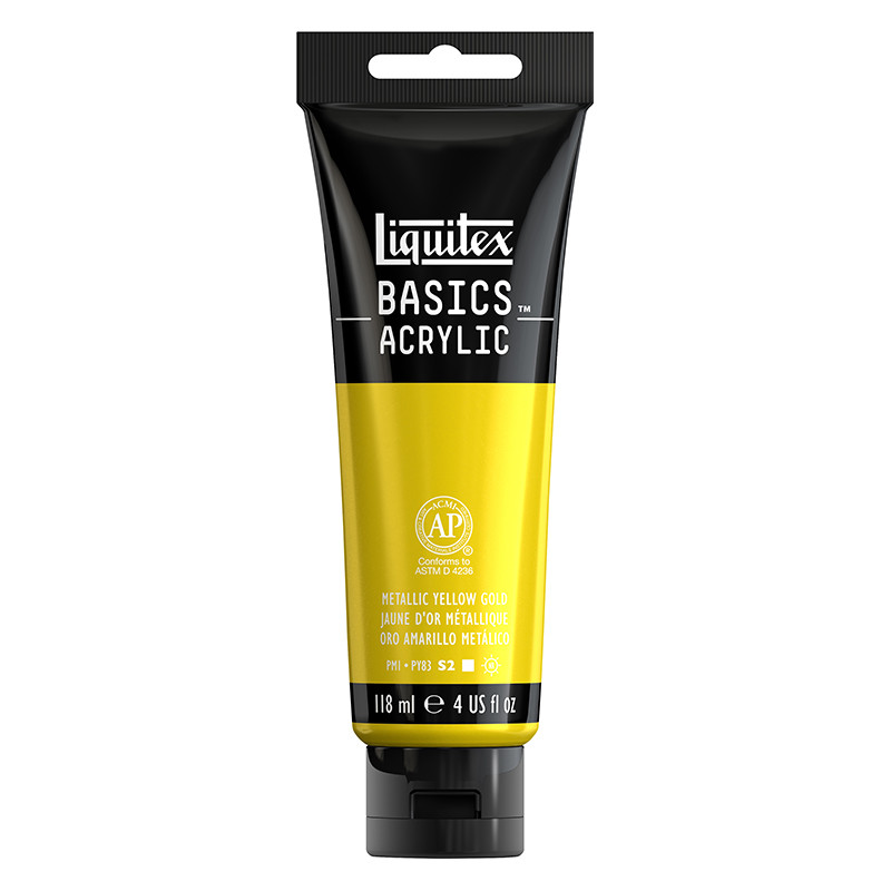 Metallic Yellow Gold / Metaliczny żółto-złoty. Farba akrylowa serii Basics amerykańskiej firmy Liquitex. Kolor nr 343. Tuba o pojemności 118 ml.